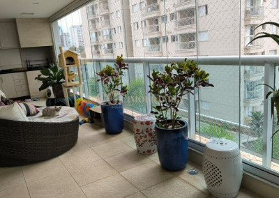 Automatização na sala e varanda, com tela de projeção de 108 polegadas no home theater.