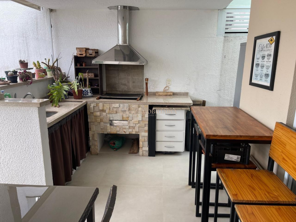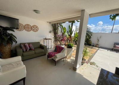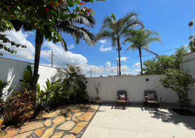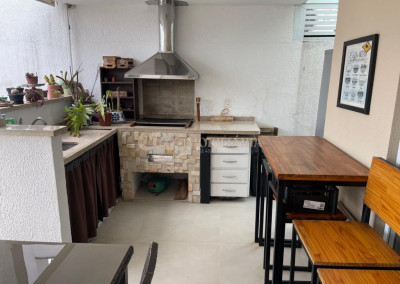 Varanda com churrasqueira e quintal nos fundos com paisagismo