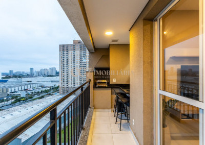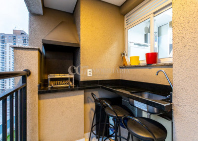 Varanda gourmet com churrasqueira, integrada à sala de estar e jantar,