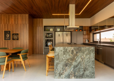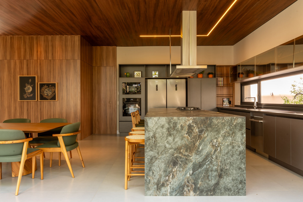 • Cozinha gourmet planejada com ilha central em mármore, eletrodomésticos embutidos de alta qualidade e integração à área externa.