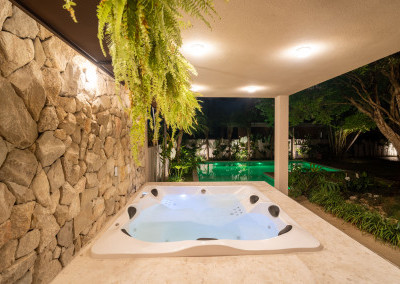 • Espaço SPA exclusivo, revestido em pedra moledo, com jacuzzi para até 7 pessoas.